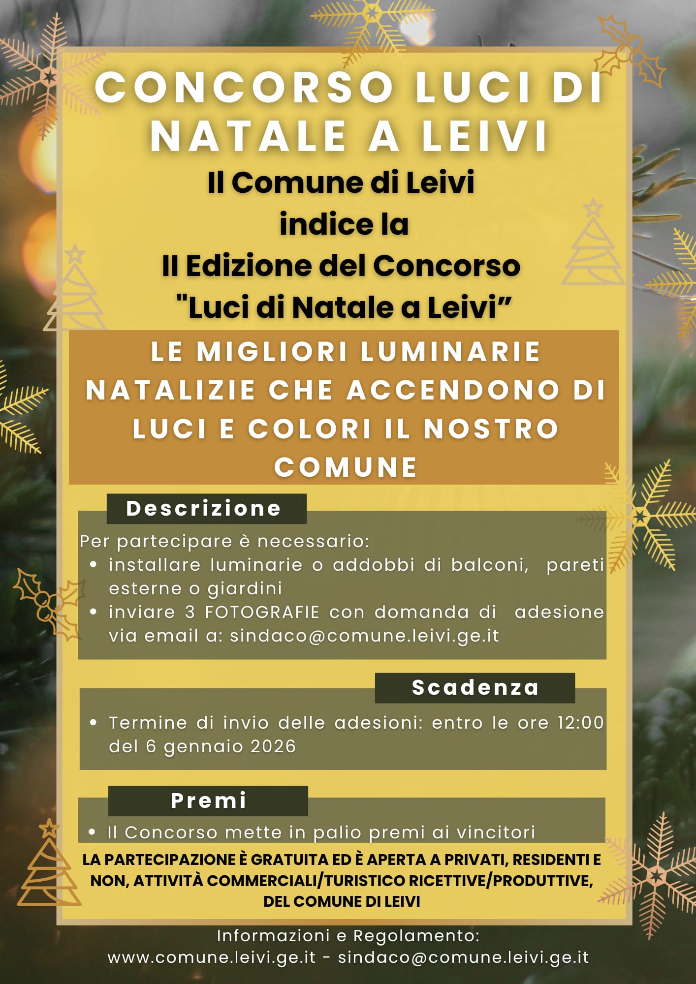 Si porta a conoscenza che anche quest'anno il Comune organizza il Concorso "Luci di Natale a Leivi". Il Concorso giunto alla seconda edizione, premierà le migliori luminarie natalizie che accenderanno di luci e colori il territorio comunale. La data di scadenza per l'adesione è il 6 gennaio 2026, ore 12.00. Si allega locandina.